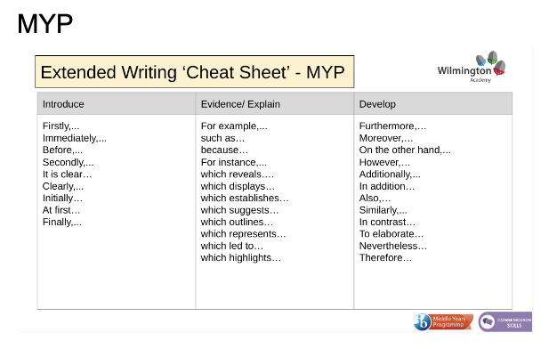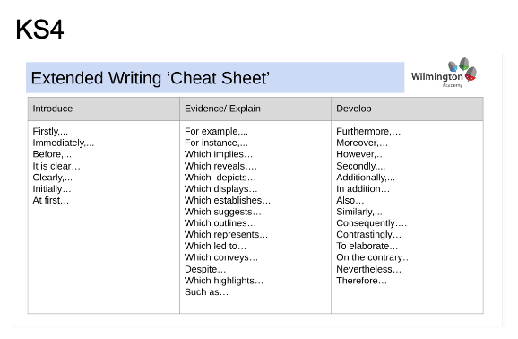 There is no doubt that the quality of extended writing relies on the students’ subject knowledge and academic vocabulary. Students will be explicitly taught academic vocabulary each module. At the end of each module, in each subject assessment, students will be provided with the ‘key terminology’ to include in their extended writing responses to allow teachers the opportunity to discover if their students both understand the academic vocabulary and can use subject specific terminology in context. In both lessons and form sessions, students will be encouraged to use their Leigh Academy Wilmington ‘Cheat Sheet’ which they keep in their blazer pocket to support their use of ambitious vocabulary and conjunctions.